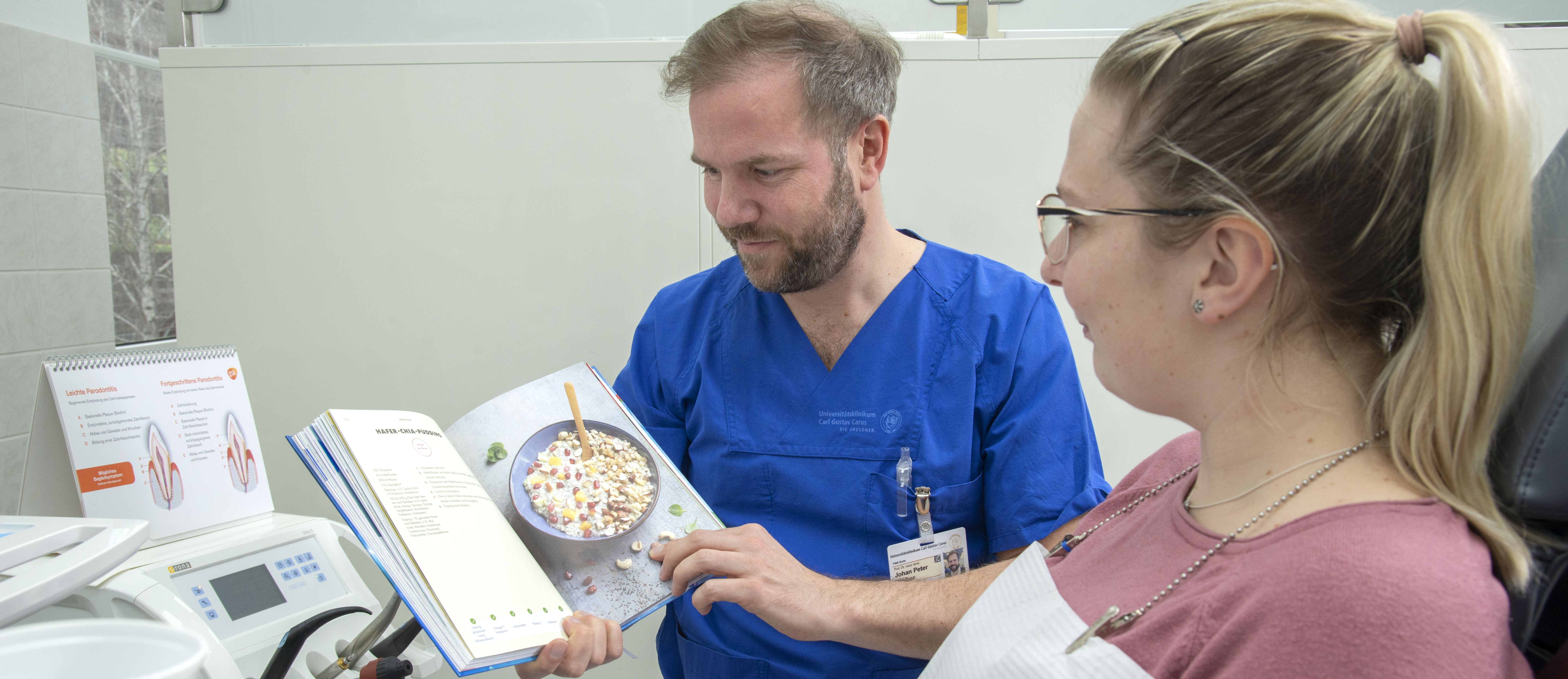 Eine (kurze) Ernährungsberatung sollte selbstverständlicher Bestandteil des Zahnarztbesuches sein; Prof. Wölber mit Patientin © Universitätsklinikum Carl Gustav Carus an der Technischen Universität Dresden (UKD)